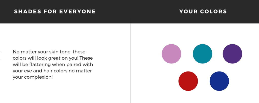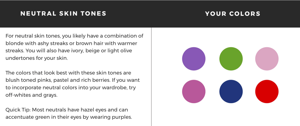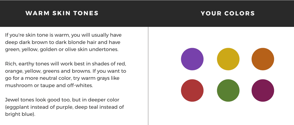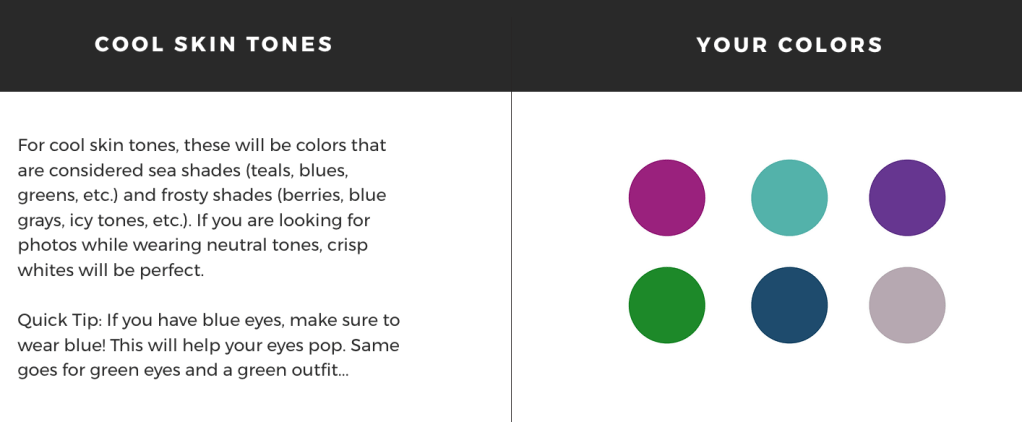 I love color, but not too much color. This means to avoid bringing clothes that are neon/fluorescent colored since this will reflect light in an unflattering way. If you’re not sure what colors work best for you, use the skin tone guide below! When picking your outfits, try to follow this as closely as possible to make sure that you love your photos and everything translates perfectly on camera!